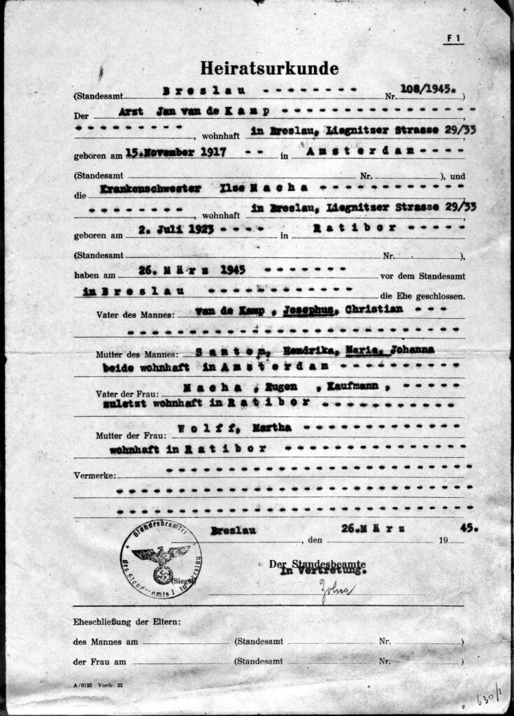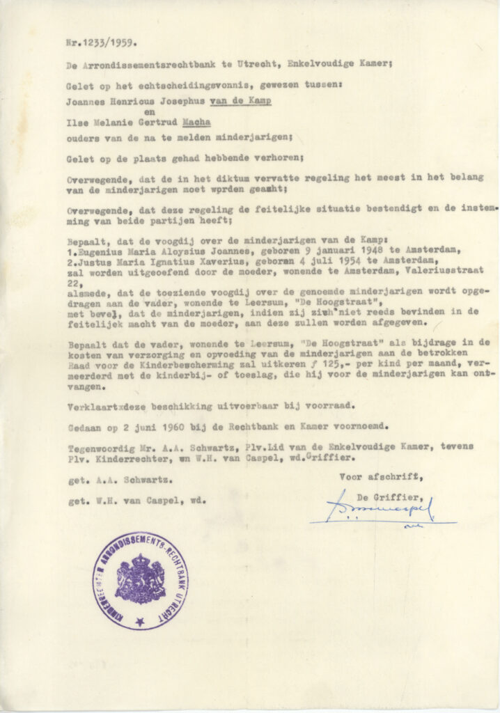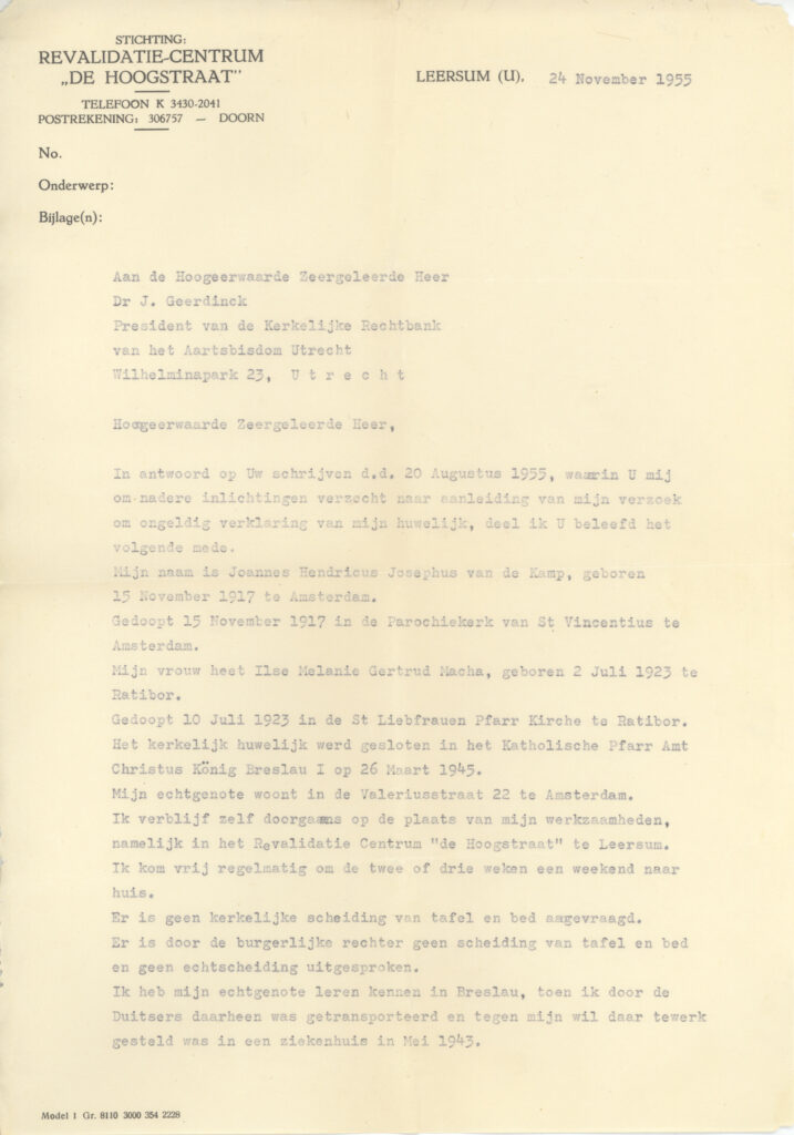 Jan van de Kamp is in 1945 in Duitsland getrouwd met Ilse Macha. Hij heeft met haar in Nederland een gezin gesticht. Het huwelijk ging echter al snel niet goed en eindigde in een scheiding in 1960. Vanaf 1955 ondernam Jan pogingen om het huwelijk voor de katholieke kerk ongeldig te laten verklaren.