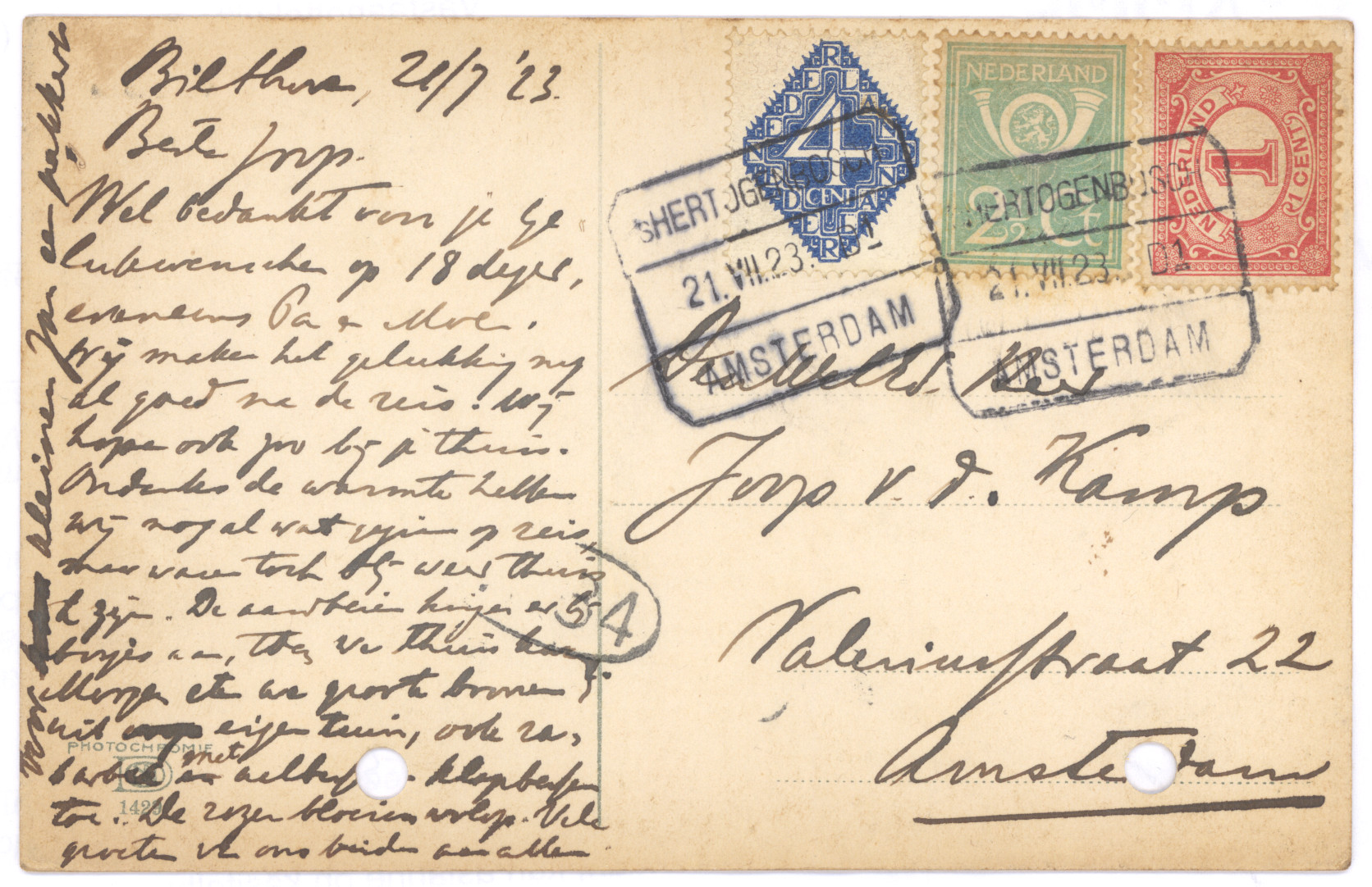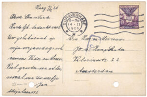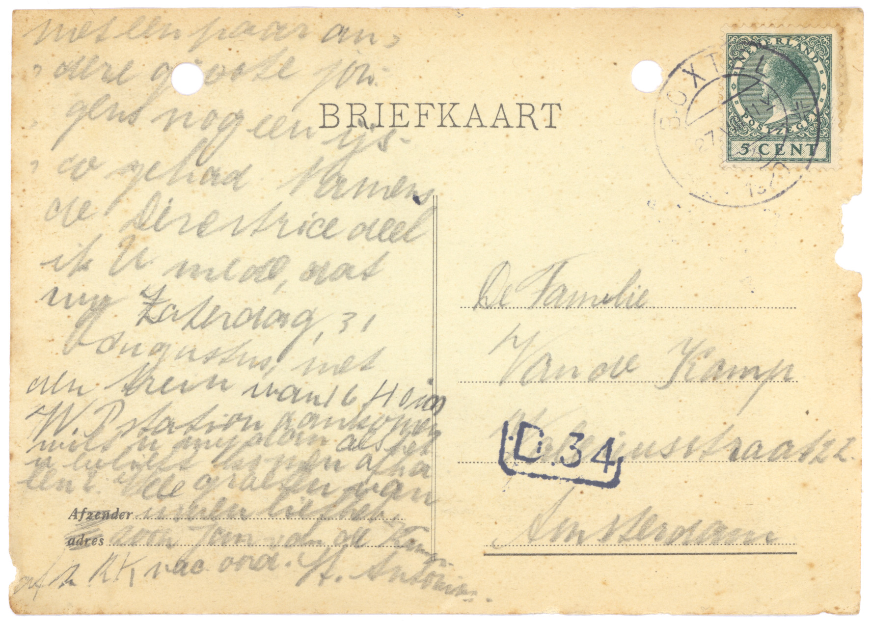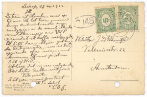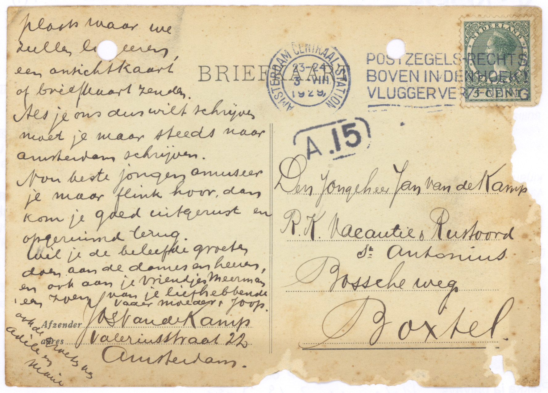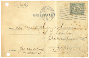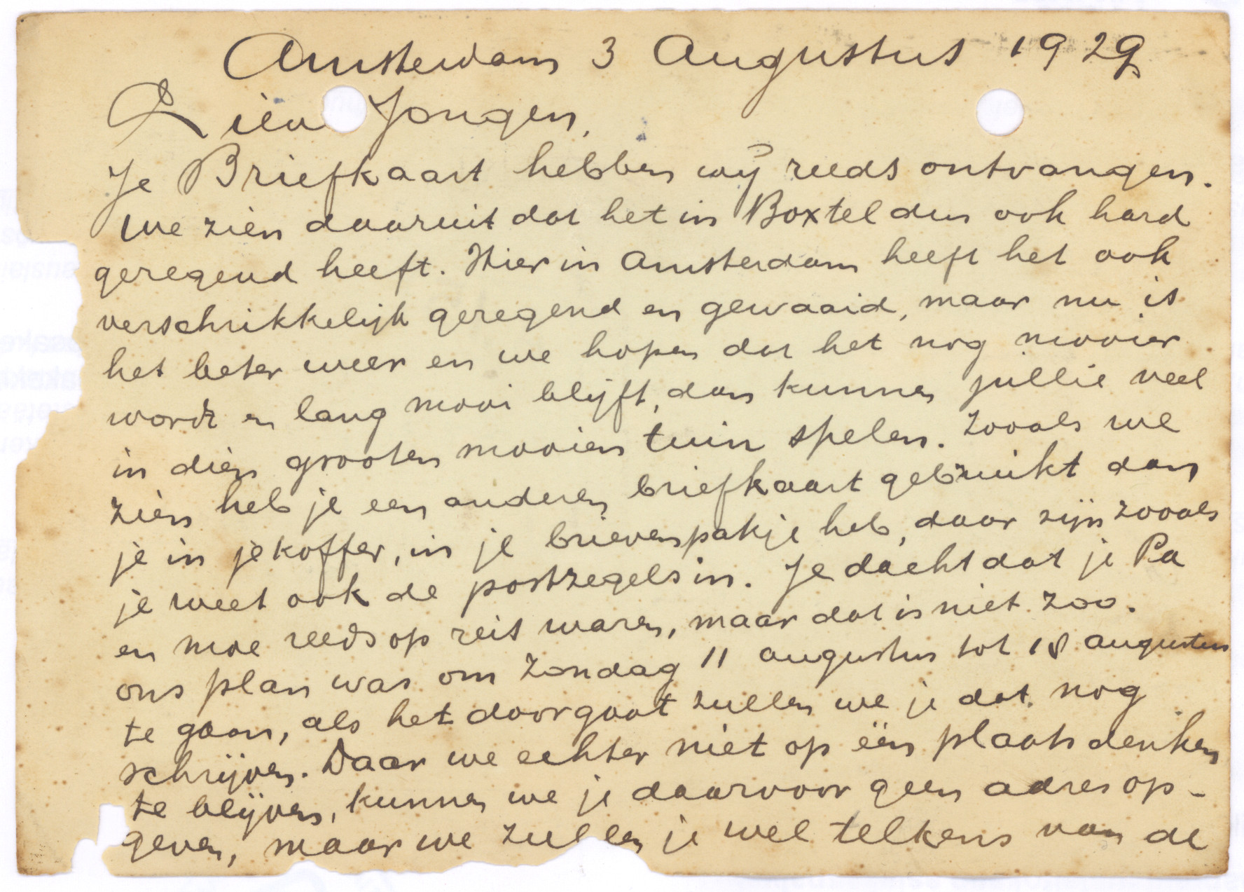 je Briefkaart hebben wij reeds ontvangen. We zien daaruit dat het in Boxtel ook hard geregend heeft. Hier in Amsterdam heeft het ook verschrikkelijk geregend en gewaaid, maar nu is het beter weer en we hopen dat het nog mooier wordt en lang mooi blijft, dan kunnen jullie veel in dien grooten mooien tuin spelen. Zooals we zien heb je een anderen briefkaart gebruikt dan je in je koffer, in je brievenpakje heb, daar zijn zooals je weet ook de postzegels in. Je dacht dat je Pa en Moe reeds op reis waren, maar dat is niet zoo. Ons plan was om Zondag 11 Augustus tot 18 Augustus te gaan, als het doorgaat zullen we je dat nog schrijven. Daar we echter niet op één plaats denken te blijven, kunnen we je daarvoor geen adres opgeven, maar we zullen je wel telkens van de plaats waar we zullen logeeren, een ansichtkaart of briefkaart zenden. Als je ons dus wilt schrijven moet je maar steeds naar Amsterdam schrijven.