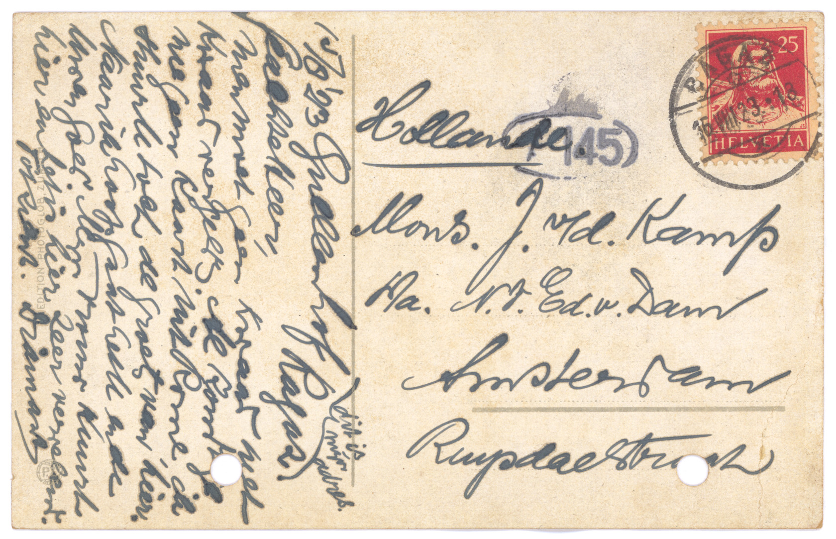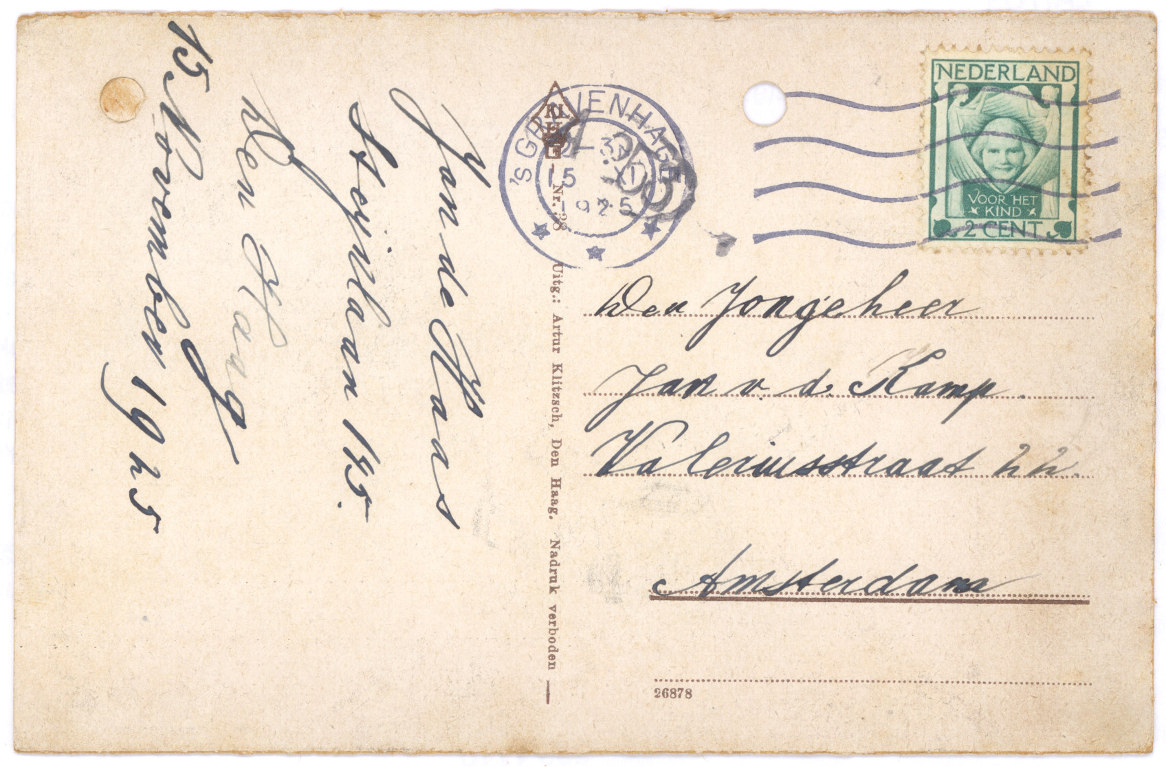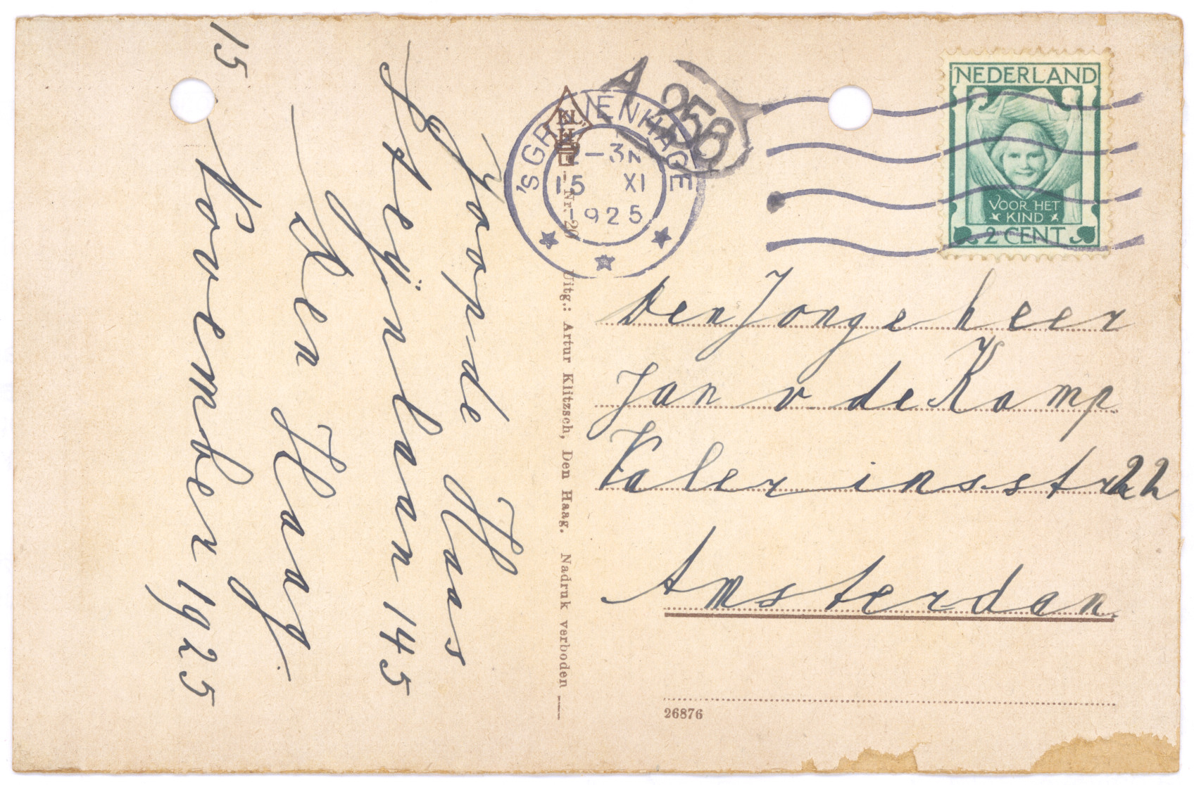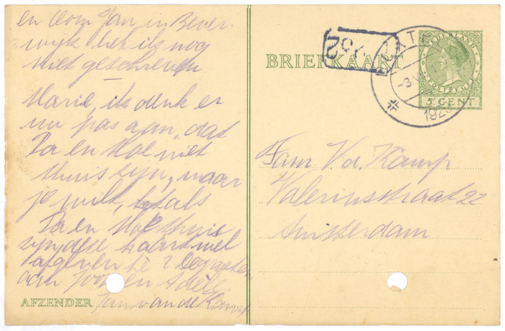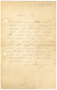 je Briefkaart hebben wij reeds ontvangen. We zien daaruit dat het in Boxtel ook hard geregend heeft. Hier in Amsterdam heeft het ook verschrikkelijk geregend en gewaaid, maar nu is het beter weer en we hopen dat het nog mooier wordt en lang mooi blijft, dan kunnen jullie veel in dien grooten mooien tuin spelen. Zooals we zien heb je een anderen briefkaart gebruikt dan je in je koffer, in je brievenpakje heb, daar zijn zooals je weet ook de postzegels in. Je dacht dat je Pa en Moe reeds op reis waren, maar dat is niet zoo. Ons plan was om Zondag 11 Augustus tot 18 Augustus te gaan, als het doorgaat zullen we je dat nog schrijven. Daar we echter niet op één plaats denken te blijven, kunnen we je daarvoor geen adres opgeven, maar we zullen je wel telkens van de plaats waar we zullen logeeren, een ansichtkaart of briefkaart zenden. Als je ons dus wilt schrijven moet je maar steeds naar Amsterdam schrijven.