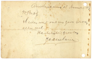 Wil je beleefde groeten doen aan de dames en heeren, en ook aan je vriendjes Meerman een zoen van je liefhebbende Vader Moeder, Joop. Ook de groeten van Adèle en Marie.