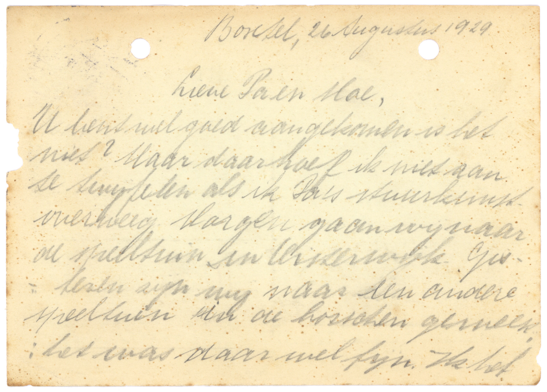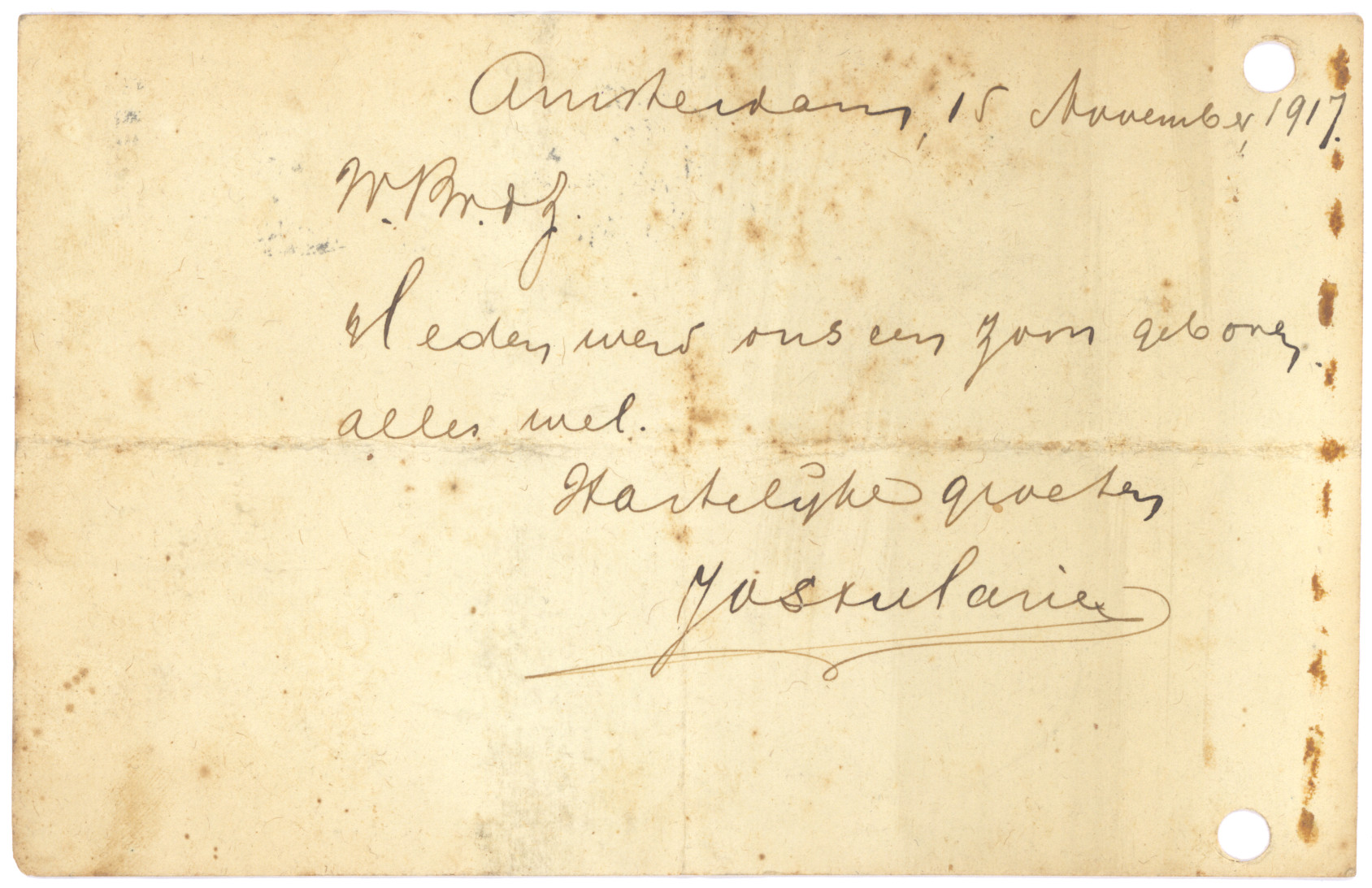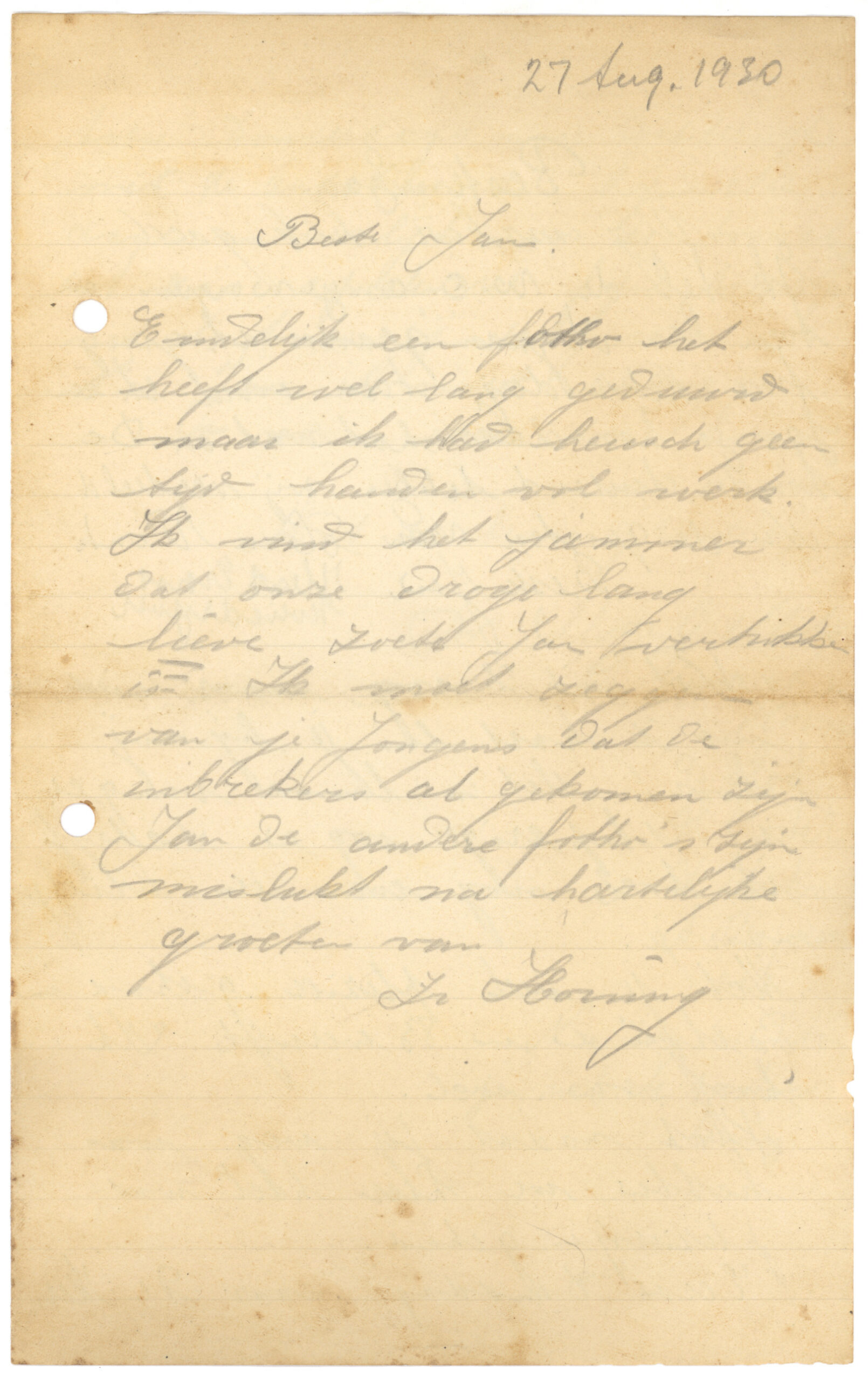 Hartelijke groeten van je (liefen?) Vader & Moeder.