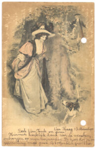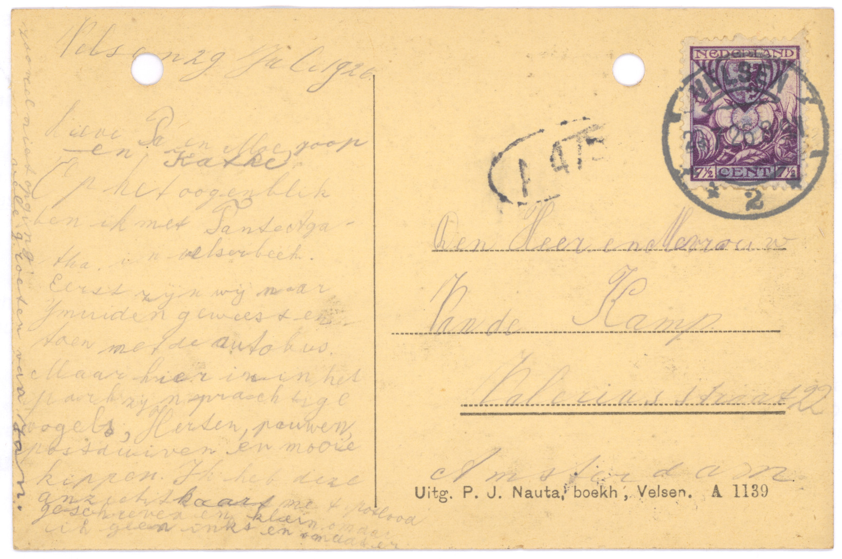 Op het oogenblik ben ik met Tante Agatha in Velserbeek. Eerst zijn wij naar IJmuiden geweest en toen met de autobus. Maar hier in in het park zijn prachtige vogels, Herten, pauwen, postduiven en mooie kippen. Ik heb deze anzichtkaart met potlood geschreven en klein omdat ik geen inkt en omdat er zoo veel niet opging, vele groeten van Jan.