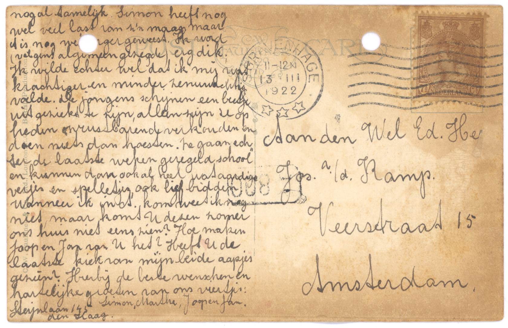 Een kaart van een familie uit den Haag, Simon en Martha, wier zoons óók Joop en Jan heten.