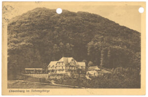 Beste Jan! Gisteren hebben wij een rijtoer gemaakt door het zevengebergte. Het rijtuig hield halt voor achterstaand hotel en wij klommen 3 kwartier tot bij een ruine van een roofridderkasteel. Het hotel Löwenburg ligt reeds op een reusachtige hoogte, waar de paarden stapvoets ons brachten. Het weer is niet zoo schitterend, evenwel op ‘t oogenblik droog. Vandaag willen wij wandelen. Doe onze groeten aan tante Hennemietje, tante Agatha, tante Leni, Juffr. Margot enz. van je liefste moeder Vader Joop.