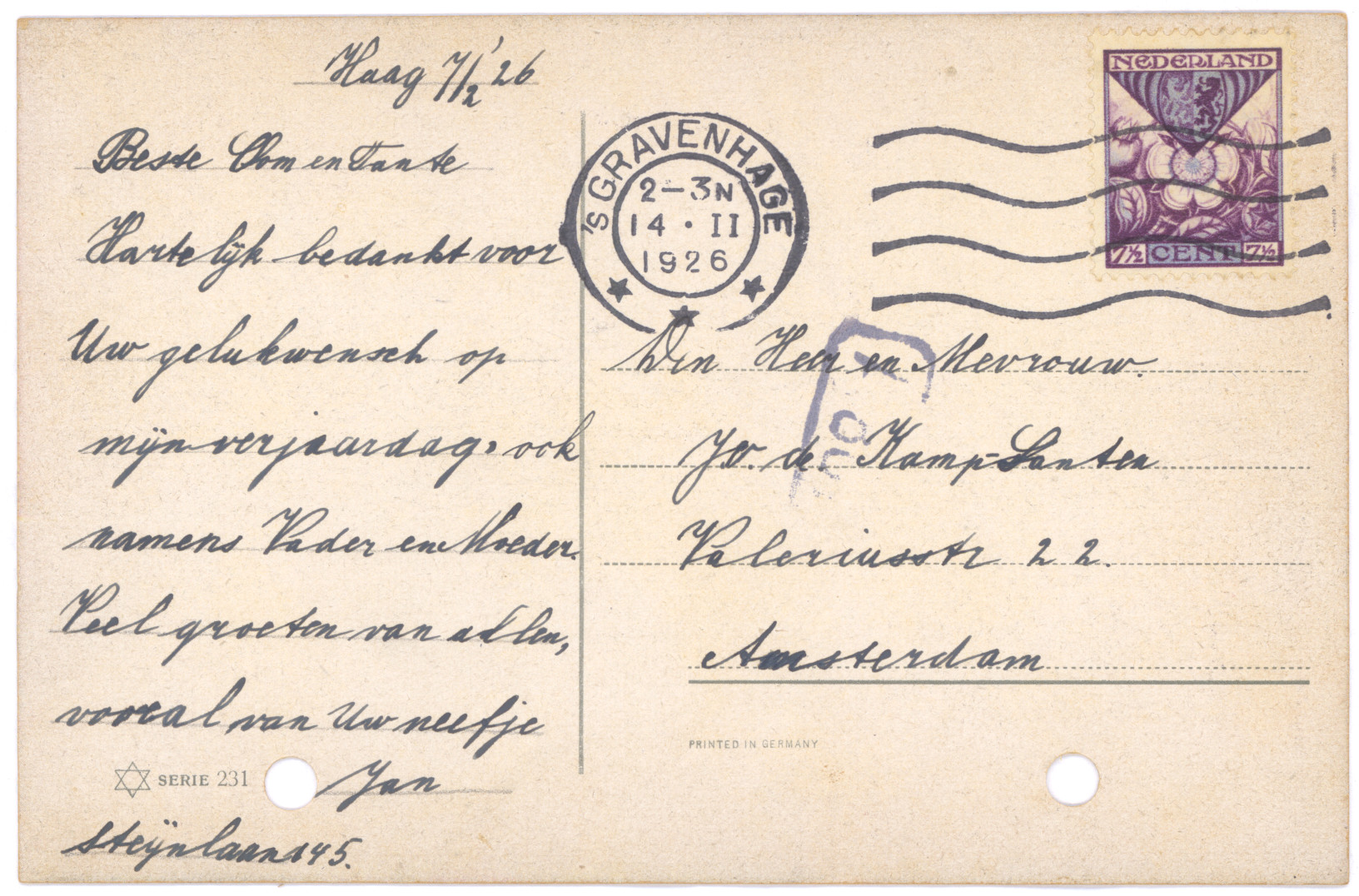 Diverse briefkaarten van en aan het gezin van de Kamp, 1917-1933.