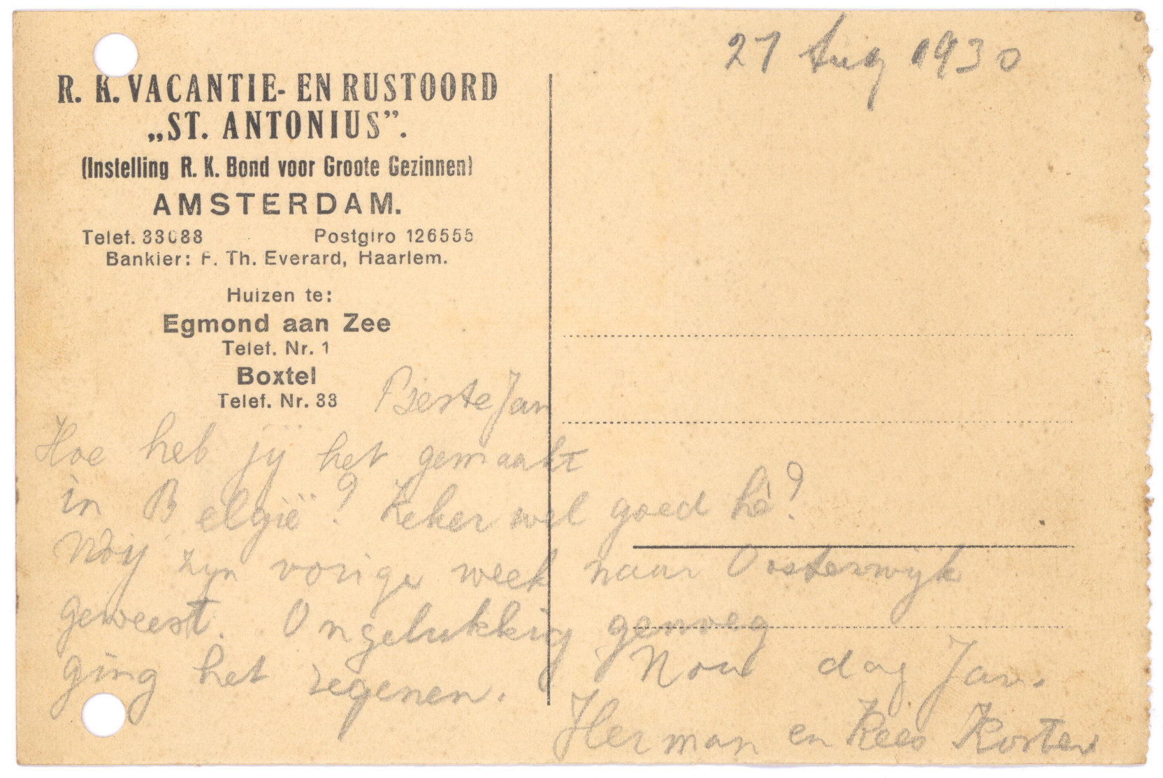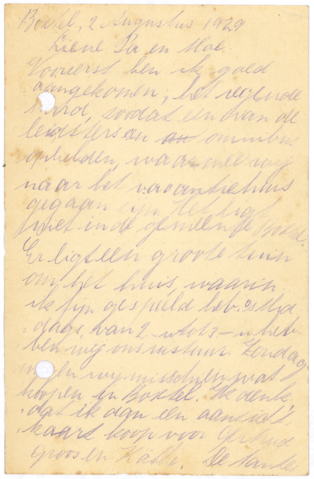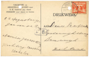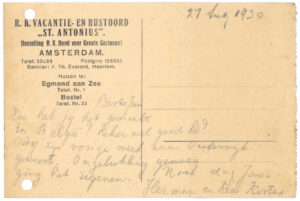 Vooreerst ben ik goed aangekomen; het regende hard, zoodat een van de leidsters een onmibus opbelden, waarmee wij naar het vacantiehuis gegaan zijn. Het ligt niet in de gemeente Boxtel. Er ligt een groote tuin om het huis, waarin ik fijn gespeeld heb. ‘s Middags van 2.- tot 3.- hebben wij ons rustuur. Zondag mogen wij misschien wat koopen in Boxtel. Ik denk dat ik dan een aanzichtkaart koop voor Gertrud Groos en Käthi. De tantes en Oom Jan in Beverwijk heb ik nog niet geschreven.