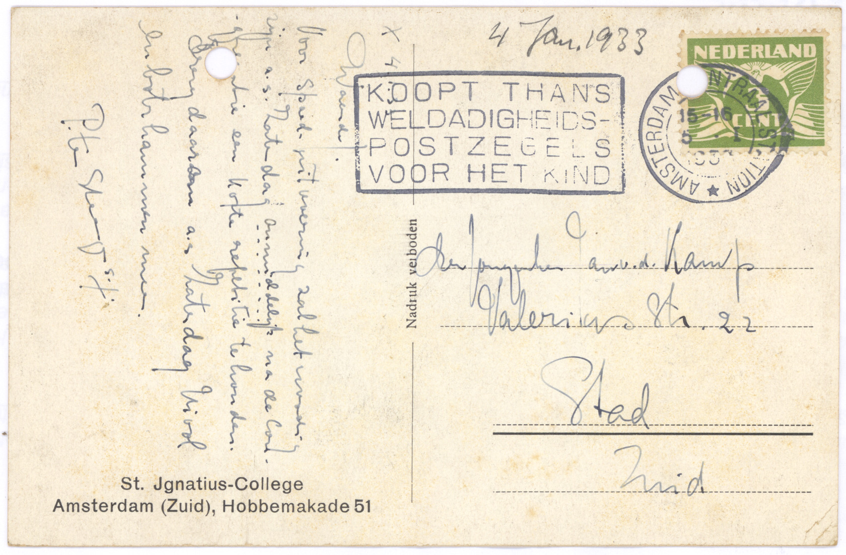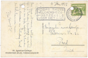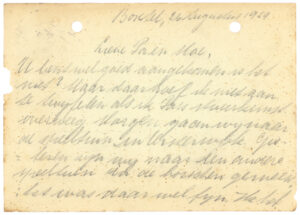 U bent wel goed aangekomen is het niet? Maar daar hoef ik niet aan te twijfelen als ik Pa’s stuurkunst overweeg. Morgen gaan wij naar de speeltuin in Oisterwijk. Gisteren zijn wij naar een andere speeltuin in de bosschen geweest; het was daar wel fijn. Ik heb met een paar van deze groote jongens nog een ijsco gehad. Namens de directrice deel ik U mede, dat wij Zaterdag, 31 Augustus, met den trein van 16 H in W. P station aankomen wilt u mij dan als het u belieft komen afhalen. Vele groeten van uwen liefheb. zoon Jan van de Kamp