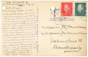 Vandaag hebben we de passiespelen gezien, het was overweldigend mooi. De omstreken zijn hier zooals je wel denken kunt schitterend. Gisteren waren we met pastoor Zandvliet uit Zevenhoven naar Partenkirchen, Ettal en Garmisch. Morgenochtend gaan we naar Kufstein. We zijn nog niet uitgeslapen, we gingen gisteravond over twaalven naar bed en vanmorgen om zes uur zat ik al geschoren en gekleed op de waranda van het huis dat je aan den achterkant hiervan ziet, we hebben hier een best pension alleen is het een beetje ver van het dorp en tamelijk hoog gelegen.