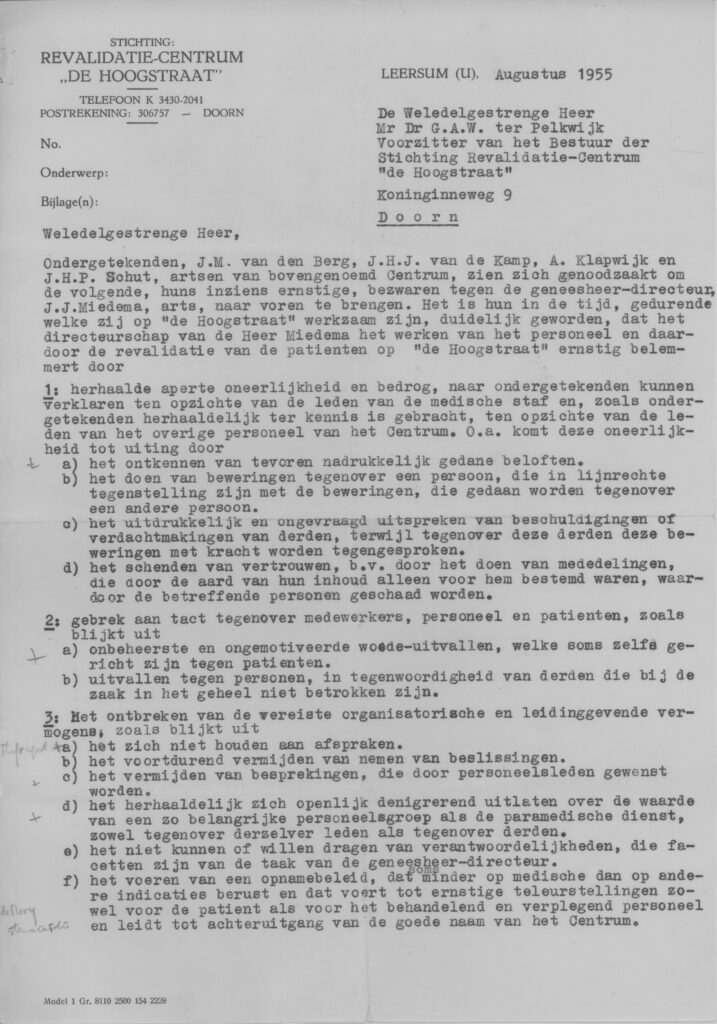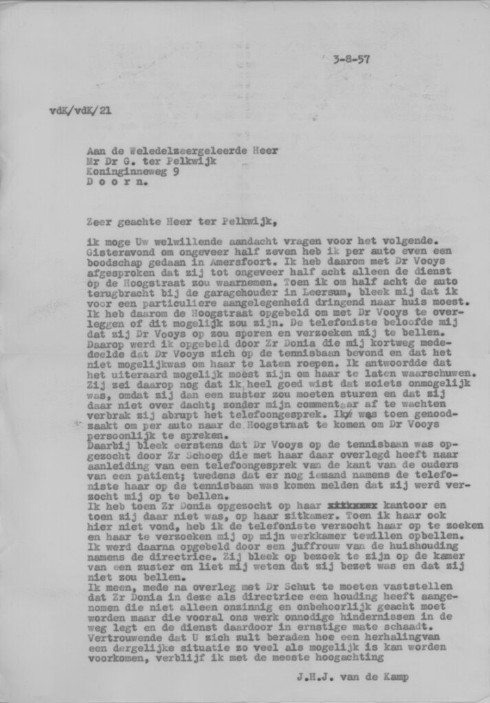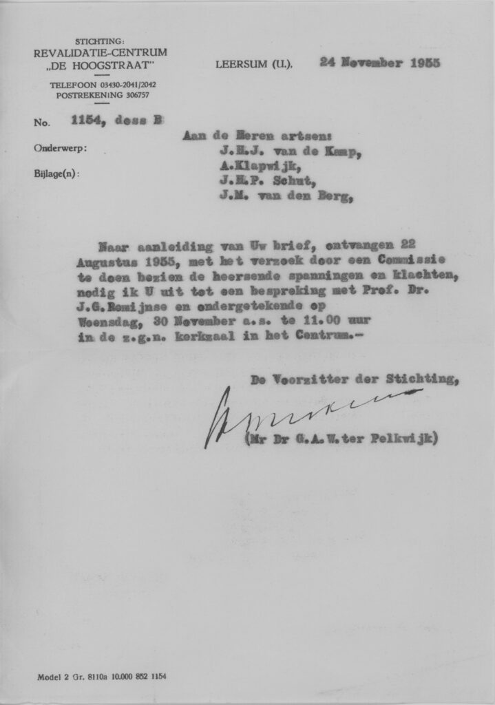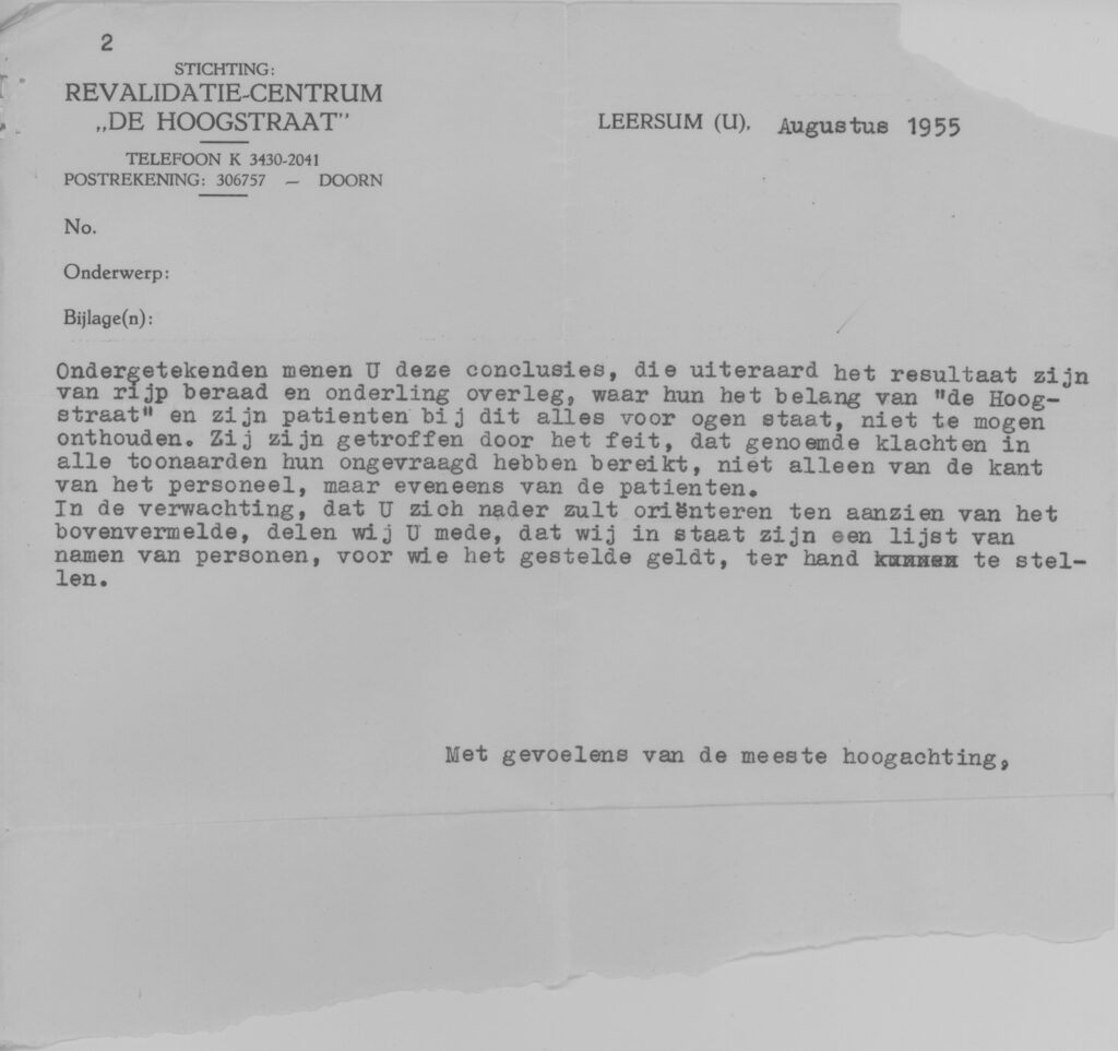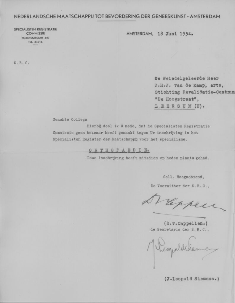 Jan van de Kamp Revalidatiecentrum de Hoogstraat Enkele brieven. Jan van de Kamp werkte van ong. 1950 tot ong. 1980 als orthopedisch chirurg in Revalidatiecentrum de Hoogstraat in Leersum.Hier zijn enkele brieven die verband houden met deze werkrelatie. Terug naar de hoofdpagina